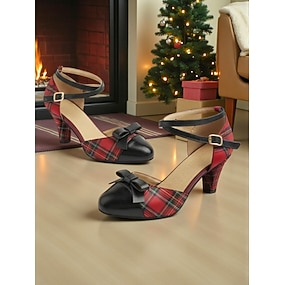 Zapatos de tacón de mujer con tira al tobillo a cuadros y detalle de lazo – estilo vintage de los años 50, cómodos tacones de bloque para Navidad, fiestas navideñas y uso diario.