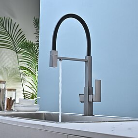 Grifo de cocina con rociador extraíble, agua purificada, grifos de doble caño, mezclador de fregadero montado en cubierta, grifo giratorio de latón con mango doble de arco alto y tubo flexible de 360 grados