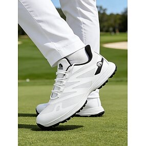 Zapatillas de golf blancas y negras para hombre con diseño ventilado, ideales para campos de golf y deportes al aire libre.
