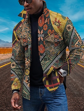 Hombre Floral Étnico Camisa de cuello Camisa de lana Chaqueta tipo camisa Manga Larga Vintage Deportivo Retro Exterior Diario Noche Verano Primavera Cuello Vuelto Estampado Amarillo Rojo Azul Piscina