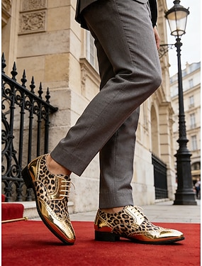Zapatos de vestir con estampado de leopardo dorado para hombre: diseño atrevido y moderno para eventos formales, celebraciones y bodas.