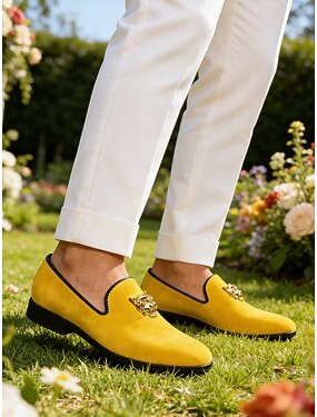 Zapatos sin cordones amarillos para hombre con emblema de león, calzado casual atrevido y moderno, ideal para eventos de moda, reuniones informales, ocasiones especiales y bodas.