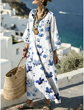Vestido maxi de mujer similar al lino transpirable ligero vestido de verano vestido de cambio vestido en línea vacaciones casual bohemio de playa para salir floral de manga 3/4 cuello redondo azul