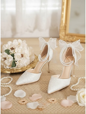 Tacones de aguja con punta de encaje para mujer: elegantes zapatos de novia con tira de perla en el tobillo para ceremonias y recepciones.
