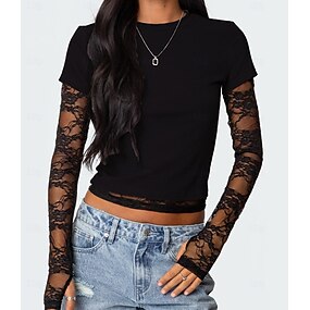 Mujer Camiseta Top de empalme de encaje Y2K Sayo Malla falso de dos piezas Elegante Sensual Casual Manga Larga Cuello Barco Tops cortos Diario Noche Negro Verde Ejército Rojo Marrón Verano Primavera