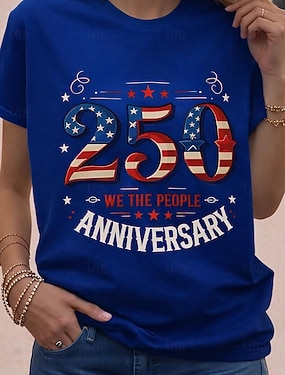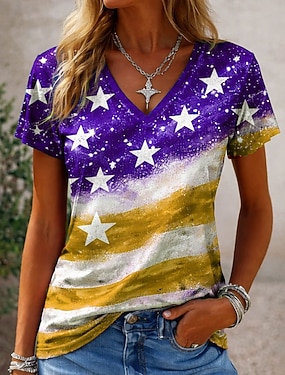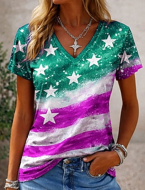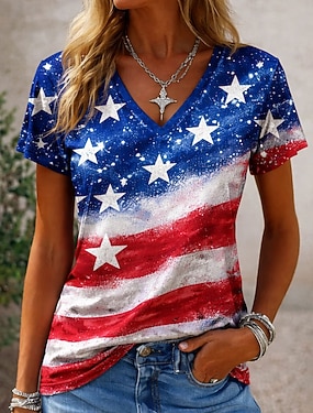 día de la independencia americana Mujer Camiseta Estampado Graphic Bandera Vintage Elegante Clásico Manga Corta Escote en Pico Tops largos Diario Negro Blanco Azul polvoriento Verano Primavera