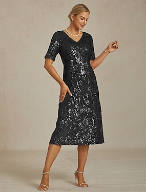 Funda Columna Hasta la Rodilla Vestido de Fiesta Vestido Cóctel Vestido Invitada Boda Vestido de Madrina Media Manga Cuello Barco Vestido negro Talla Grande Brillos Y Estrellas Noche formal Fiesta de