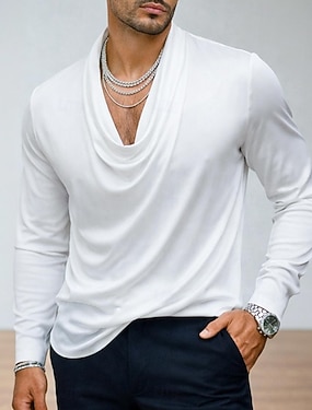 Hombre Camisa Como la seda Camisa de raso Camisa casual Plano Formal Boda Negro Blanco Azul Marino Dorado Manga Larga Cuello vuelto holgado Primavera & Otoño Todas las Temporadas Ropa Frunce