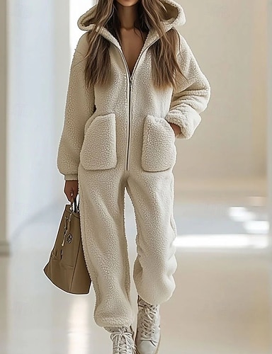 Mujer Ropa de salón Monos Cálido Moda Sensual Color puro Cremallera Bolsillo Sudadera Vacaciones Hogar Calle Manga Larga Cuello Barco Blanco Otoño Invierno Holgado