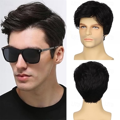 Peluca corta negra para hombre, de aspecto natural, de cabello sintético resistente al calor, con gorro ajustable, 180 g.
