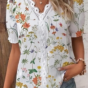 Mujer Camiseta Camiseta de encaje Camiseta superior Encaje Plano Elegante Moda Clásico Manga Corta Escote en Pico Tops regulares Diario Noche Fin de semana Blanco Verano Primavera