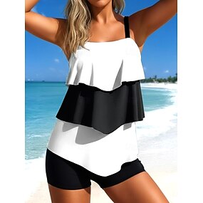 Traje de baño mujer tankini de 2 piezas color bloque cintura alta con volantes espalda descubierta vacaciones playa ombre gráfico escote en U sin mangas