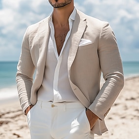 De los hombres Trajes de Lino boda en la playa Beige Verano Traje Solapa de Pico Ligeras Casual Color sólido Estándar Juego de 2 piezas Recto 1 botón