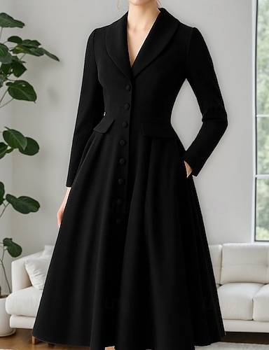 Vestido de esmoquin formal para boda, para invitados de boda, de sarga, elegante, formal, de manga larga, plisado, largo midi, con solapa chal, botonadura sencilla.