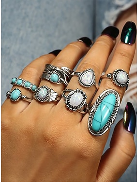 Conjunto de anillos bohemios de turquesa para mujer: anillos apilables de aleación vintage con detalles de piedras preciosas para estilo occidental, festivales o uso diario.