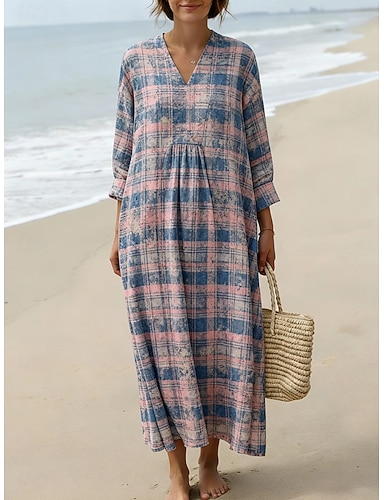 Vestido Maxi de Mujer Lino Similar Transpirable Ligero Vestido de Sol Corte A Vacaciones Casual Boho Playa Ajuste Holgado Gráfico Paisley Manga 3/4 Cuello en V Azul Rosa Naranja Beige Verano Primavera