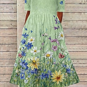 Mujer Vestido Midi Vestido informal Vestido Estampado Vintage Exterior Vacaciones Noche Holgado Floral Graphic Media Manga Cuello Barco Azul Piscina Púrpula Claro Morado Verde Trébol Verano Primavera