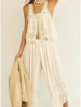 Mujer Conjuntos de pantalones parte superior del bolero Sin Mangas Escote Cuadrado Plano Frunce Encaje Retazos Activo Moda Ropa de calle Casual Diario Exterior Blanco Rojo Marrón Verano Holgado