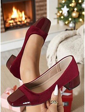 Zapatos de tacón cuadrado de charol rojo y terciopelo para mujer, punta cuadrada, elegantes y cómodos, perfectos para Navidad, ropa de oficina y eventos diarios.