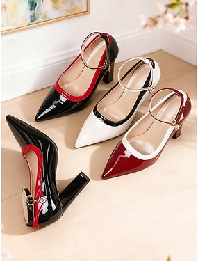 Tacones altos con tira en el tobillo de piel sintética de charol burdeos para mujer: zapatos de punta puntiaguda con color de contraste vintage para uso diario elegante, fiestas y ocasiones