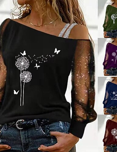 Mujer Blusa Encaje Malla Mariposa Vintage Elegante Manga Larga hombro frío Tops regulares Diario Festivos Noche Azul Piscina Negro Vino Morado Verde Trébol Primavera Otoño