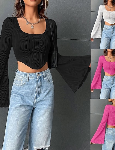 Mujer Blusa Color sólido Elegante Casual Manga Larga Escote en U Tops cortos Ropa de calle Festivos Noche Negro Blanco Fucsia Primavera Otoño