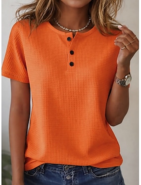 Mujer Talla grande Camiseta con diseño de gofre Camiseta superior Botón frontal Elegante Casual Manga Corta Henley Tops largos Diario Noche Negro Blanco Amarillo Rojo Naranja Verano Primavera