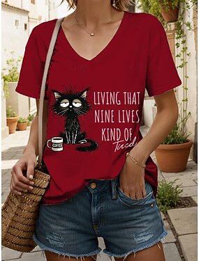 Mujer Camiseta Estampado Graphic Animal Gato Vintage Elegante Clásico Manga Corta Escote en Pico Tops regulares Diario Azul Piscina Negro Blanco Rosa Rojo Verano Primavera