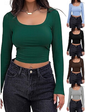 Mujer Camiseta Plano Moda Elegante Básico Manga Larga Cuello Barco Tops regulares Diario Fin de semana Negro Blanco Rosa Caqui Beige Verano Primavera Otoño