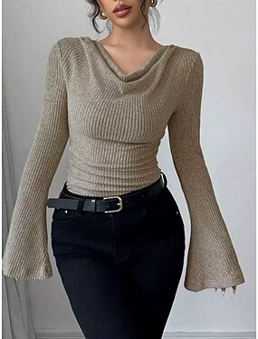 Mujer Blusa Frunce Color sólido Elegante Básico Casual Manga Larga Cuello vuelto holgado Tops regulares Diario Negro Vino Verde Trébol Caqui Gris Primavera Otoño Invierno