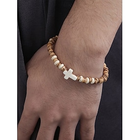 Pulsera de cuentas de madera natural para hombre con cruz turquesa: pulsera elástica bohemia hecha a mano para ropa informal, atuendos de verano y ambiente playero.
