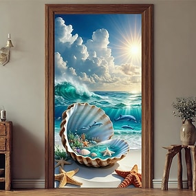 Pancarta para puerta de estilo costero tropical con paisaje de playa oceánica en 3D, conchas marinas gigantes, delfines, estrellas de mar, sol y olas. Decoración para la puerta principal, el hogar, el