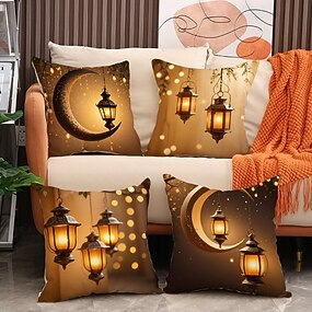 Funda de almohada para Ramadán Eid, luna &Estampado de lámpara de aceite, cojín de sofá transpirable, decoración festiva para el hogar, sala de estar y sala de oración, almohada decorativa navideña
