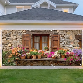 Cubierta de puerta de garaje de casa de piedra rústica, impresión plana 2D con jardineras de flores vibrantes &Decoración encantadora de contraventanas