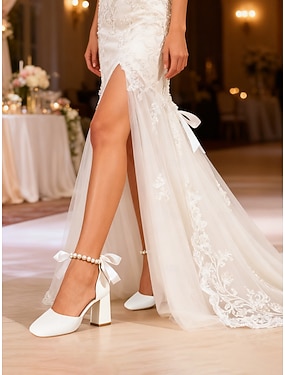 Zapatos de novia con tacón de bloque, tira al tobillo de perla y lazo de satén, elegantes zapatos de boda de punta cerrada para novias, cómodos zapatos de ceremonia con tacón grueso.