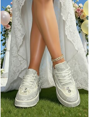 Zapatillas de boda con plataforma y diamantes de imitación plateados para mujer: un estilo nupcial brillante para bodas al aire libre en jardines.