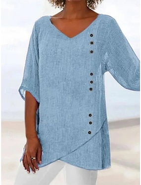 Mujer Camisa Camisas de algodón y lino Blusa Botones Color sólido Elegante Clásico Moderno Media Manga Escote en Pico Tops regulares Diario Festivos Noche Azul Piscina Verano Primavera