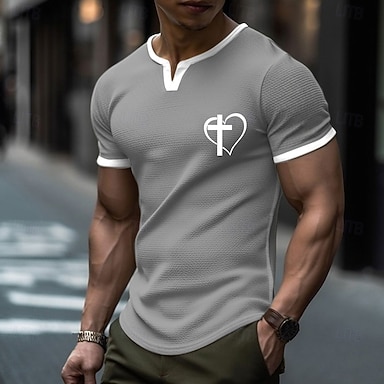 Camiseta Henley minimalista con cuello en V, estampado de cruz y corazón para hombre, ideal para la fe cristiana y el amor. Diseño ajustado, corte entallado, textura gofrada, perfecta para la Pascua,