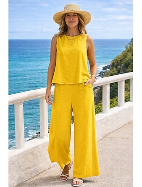 Mujer Conjuntos de lino y algodón Chaleco de lino y algodón Conjuntos de pantalones Sin Mangas Cuello Barco Color sólido Moda Ropa de calle Casual Diario Exterior Blanco Amarillo Beige Verano Ajuste