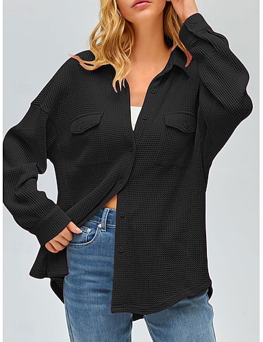 Mujer Camisa de manga corta Camisa casual Blusa Botones Color sólido Elegante Formal Manga Larga Cuello Vuelto Tops regulares Diario Trabajo Festivos Negro Blanco Azul Marino Marrón Primavera Otoño