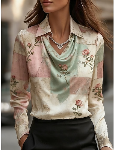 Mujer Camisa Elegant Top de satén Tops de Seda Estampado En Cortina Floral Elegante Casual Manga Larga Cuello vuelto holgado Tops regulares Diario Trabajo Festivos Verde Trébol Primavera Otoño