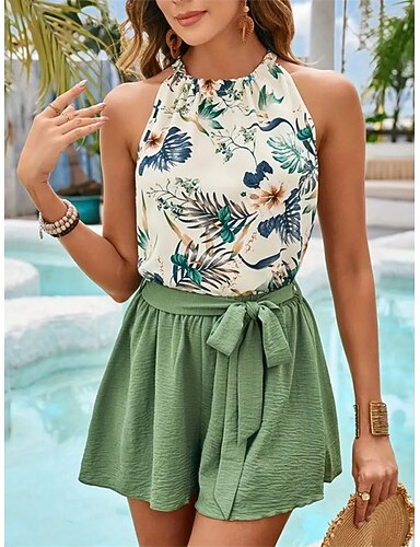 Mujer Camisa Pantalones cortos holgados Sin Mangas Cuello halter Floral Acordonado Estampado Moda Ropa de calle Diario Casual Diario Verde Trébol Verano Ajuste regular
