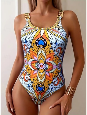 Traje de baño de una pieza para mujer Monokini ajustado Boho Control de abdomen Cintura alta Delgado Espalda descubierta Ropa de playa de vacaciones Gráfico vintage Geométrico Cuello en U Sin mangas