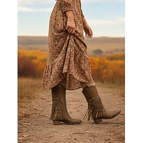 Botines marrones para mujer con tiras de borlas: botines de tacón bajo de ante sintético de estilo western informal para otoño, ropa de calle y atuendos diarios.