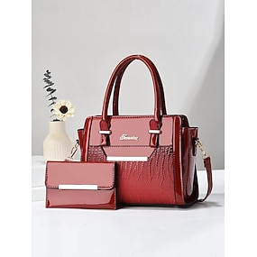 Conjunto de bolso de mano de piel sintética con charol para mujer: bolso de mano con asa superior, estructura brillante y billetera, con elegante estampado de cocodrilo, ideal para la oficina, negocios y eventos formales.