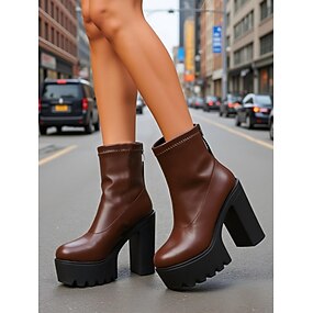 Botines marrones de plataforma gruesa para mujer con tacones altos de bloque: elegantes botas casuales con cremallera para uso diario y moda urbana.