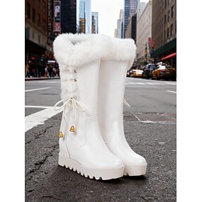 Botas de nieve de cuña con forro de piel sintética blanca para mujer: botas de invierno impermeables con cordones y suela de plataforma, elegantes y cómodas para climas fríos y actividades informales