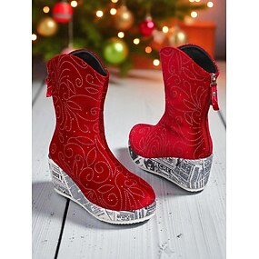 Botines de cuña de terciopelo rojo para mujer con diseño de diamantes de imitación brillantes y suela estampada, zapatos de fiesta de invierno de moda para Navidad. &salir de noche