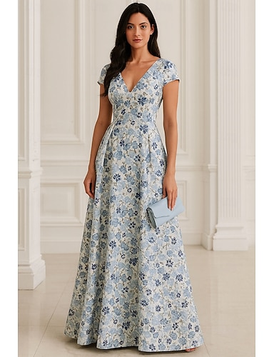 Corte A Hasta el Suelo Vestidos de noche Elegante Floral Manga Corta Escote en Pico Boda Formal Jacquard con Estampado flor Plisado