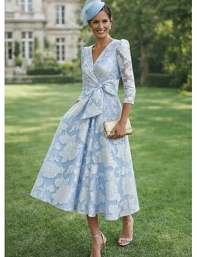 Corte A Vestido Midi Vestidos de coctel Vestidos de fiesta Elegante Floral Manga 3/4 Escote en Pico Boda Invitado a la boda Satén con Lazo(s) Apliques